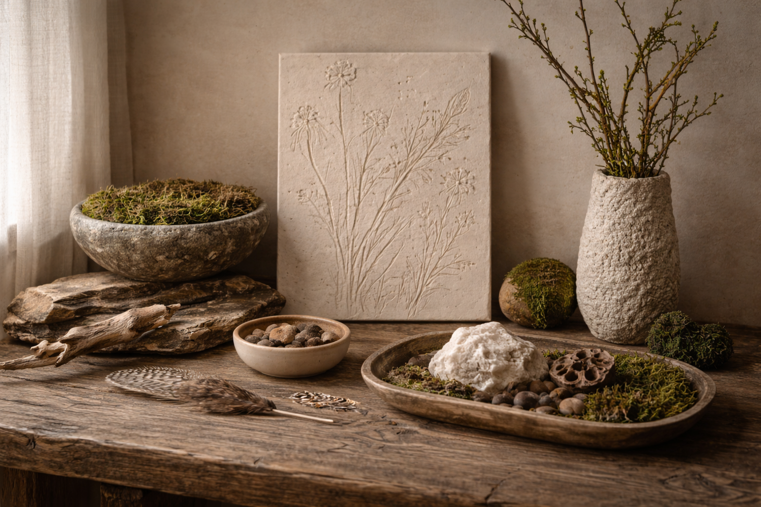 We select pieces made with natural elements or inspired by them — stone, moss, botanical forms, raw surfaces. Nothing artificial. Only what feels alive.